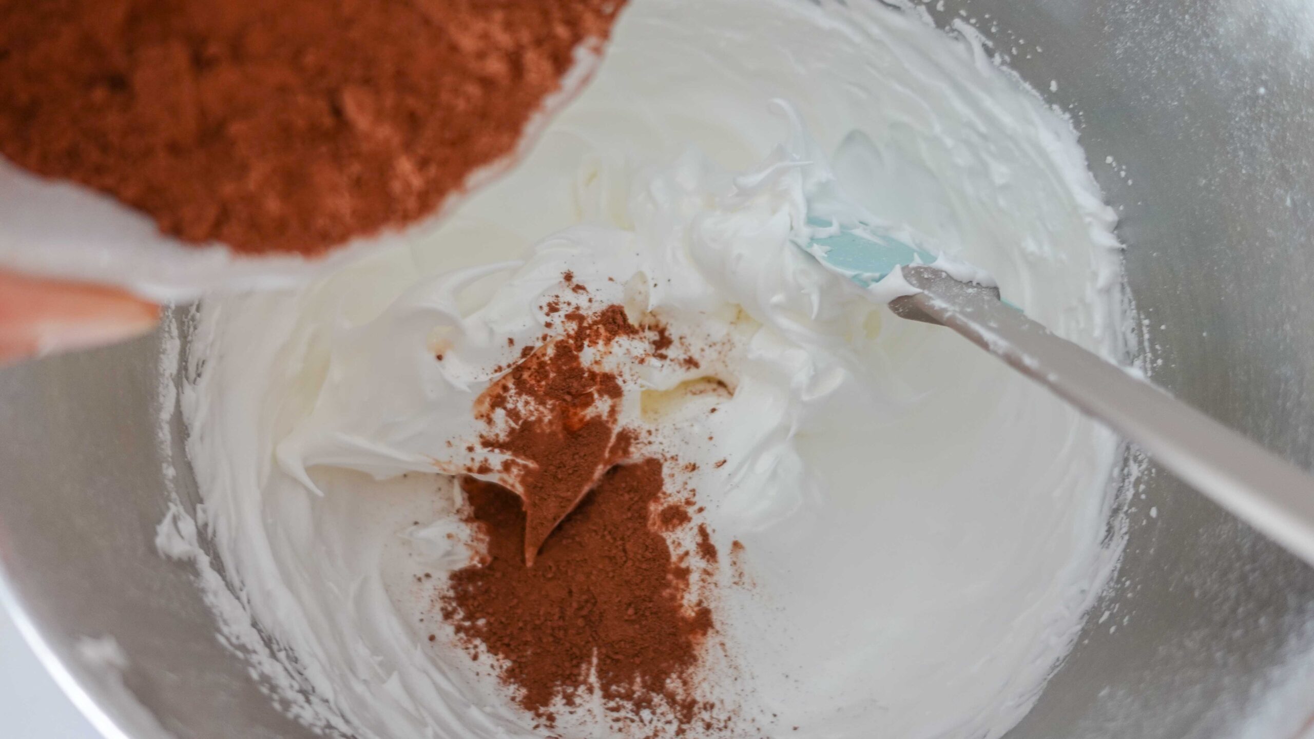 When the egg whites mixture becomes thick and glossy, you need to stop beating, add cacao and fold it gently into the mixture.