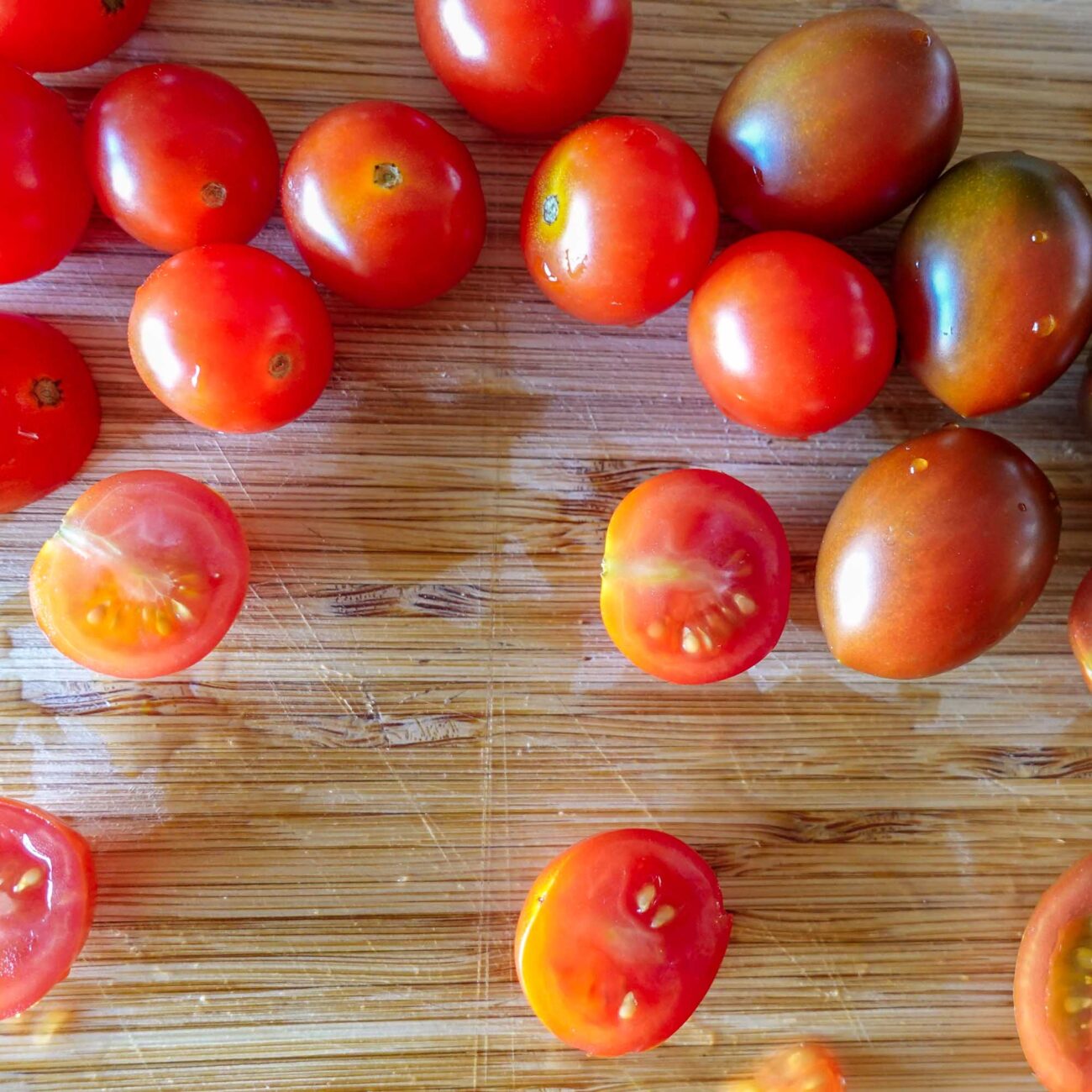 I usually buy red cherry tomatoes or black cherry tomatoes at the farmer’s market, where you can find the best quality ingredients.