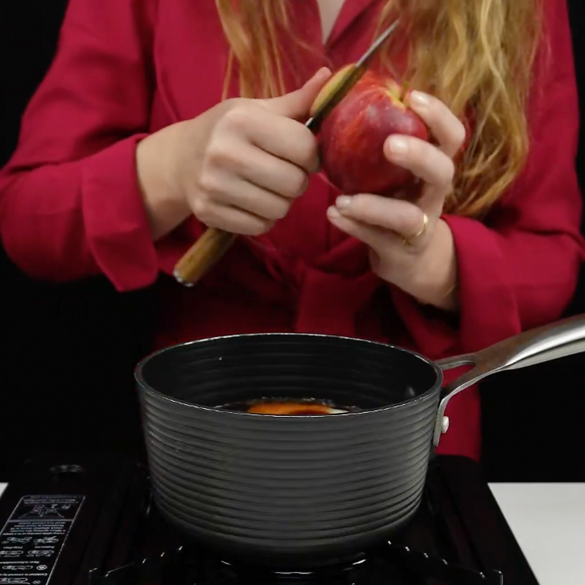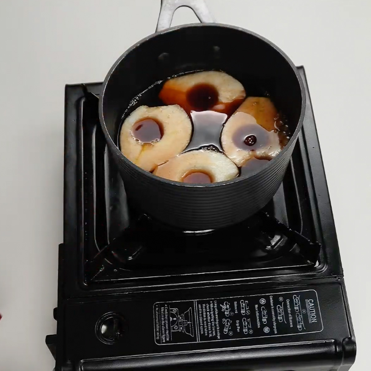 Step 3. Poach the pears20 minutes Carefully add the pears to the simmering liquid. Add the apple slices if using. Reduce heat to low, and simmer for 15–22 minutes, turning the pears occasionally to ensure even color and flavor. Pears are done when a knife slides in easily but the fruit still holds its shape. Remove the pears and apple slices from the pan and set them upright on a serving plate. Increase heat to medium-high and boil the remaining liquid until it thickens into a glossy syrup, about 8–12 minutes. |
