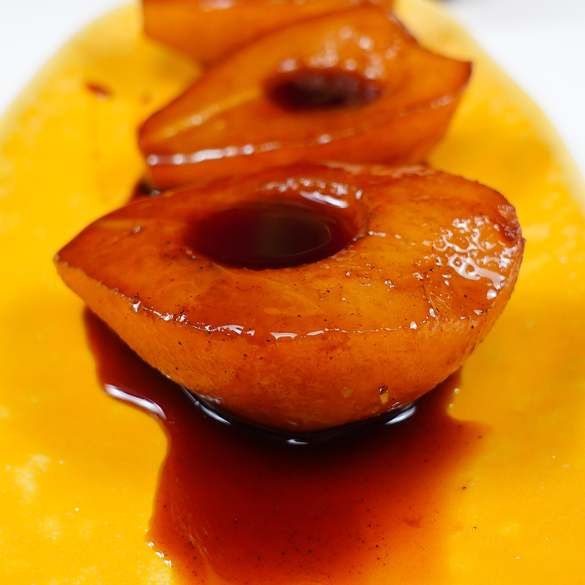 The warm notes of Port wine, enriched by cinnamon, honey, and vanilla sugar, elevate the fruit, while the lemon juice and zest balance the sweetness with a hint of brightness. The addition of a few slices of apple during poaching subtly layers textures and flavors, making each bite complex yet harmonious.