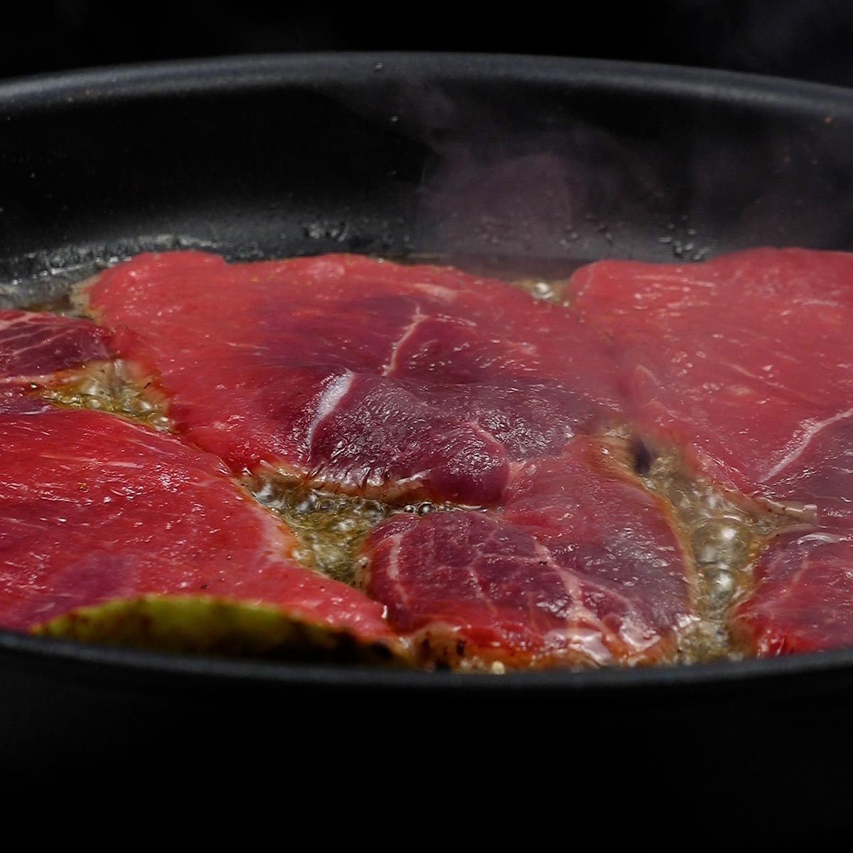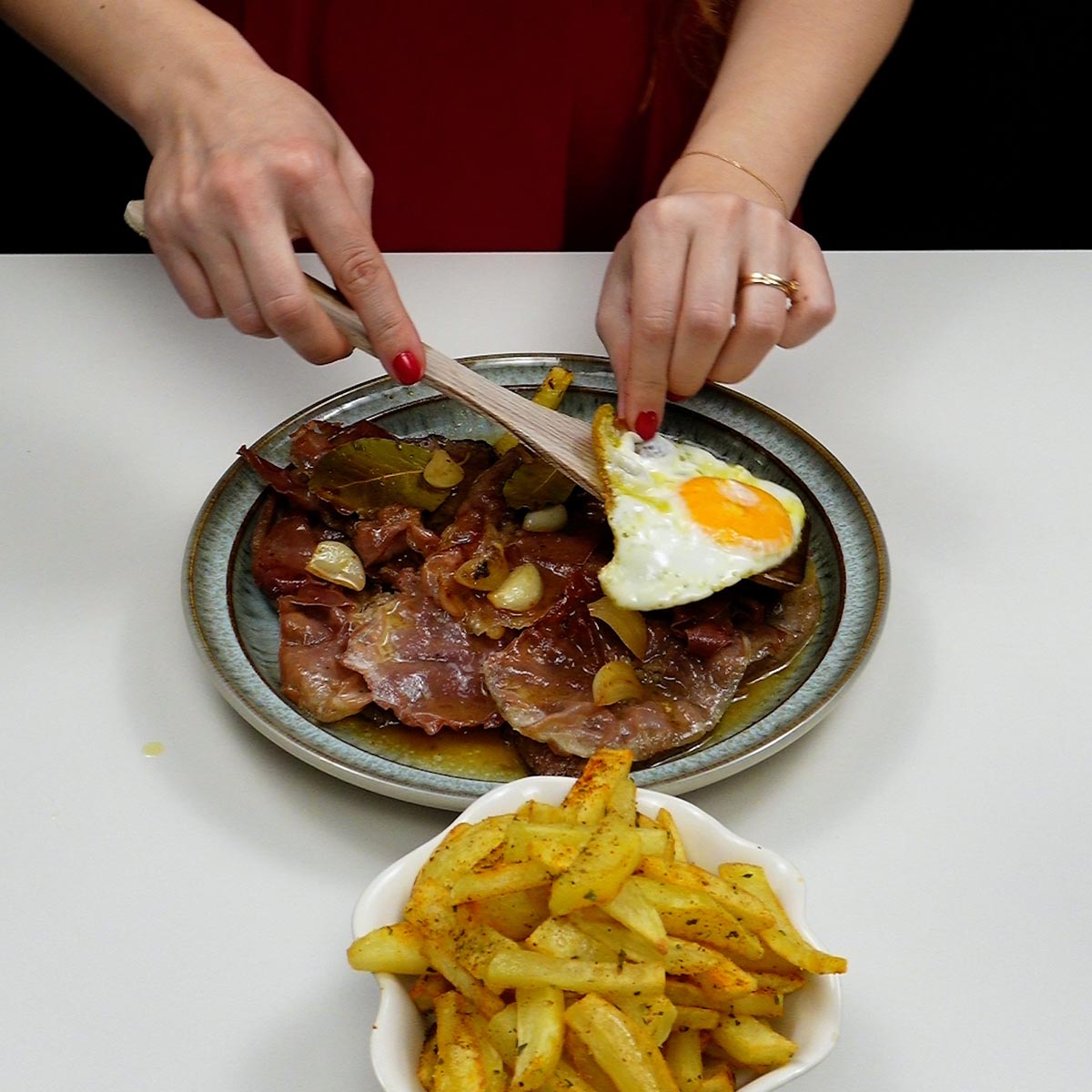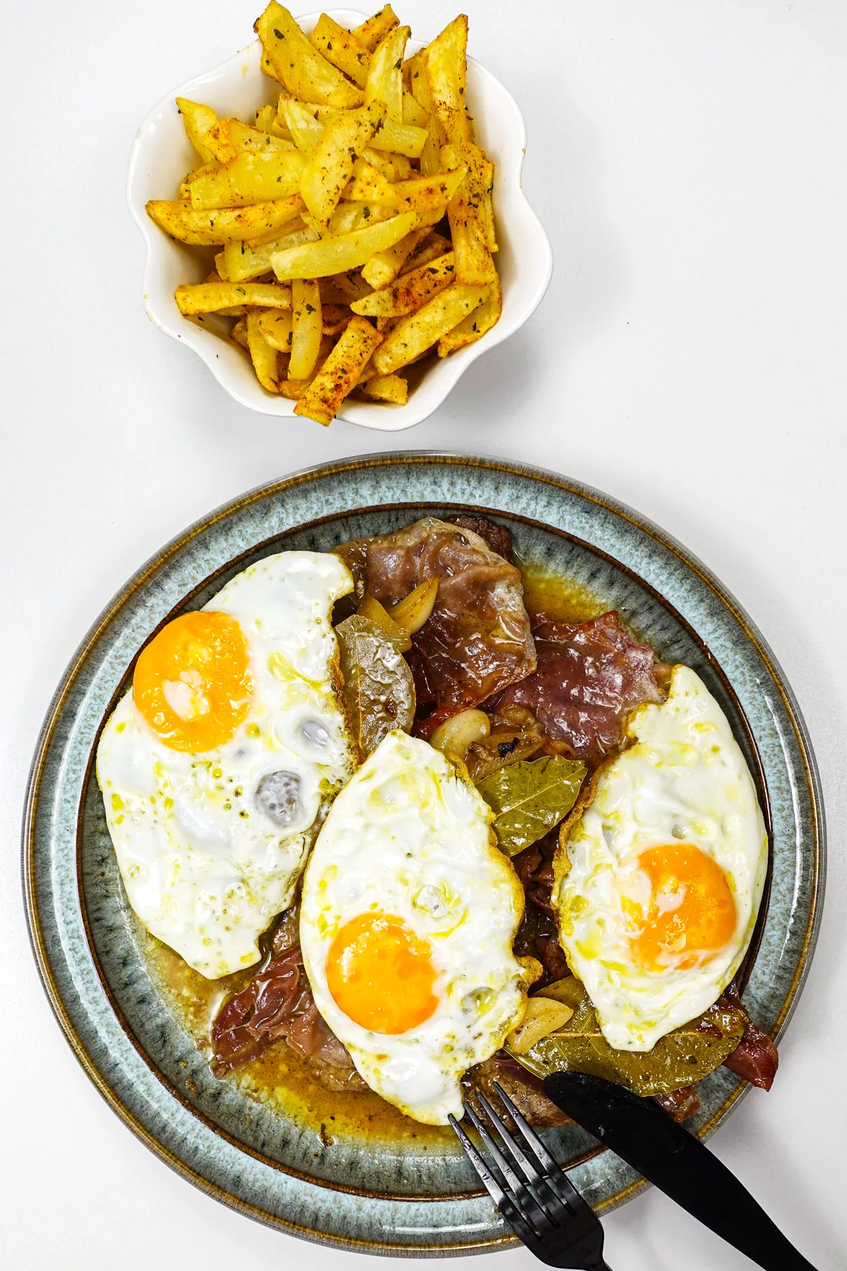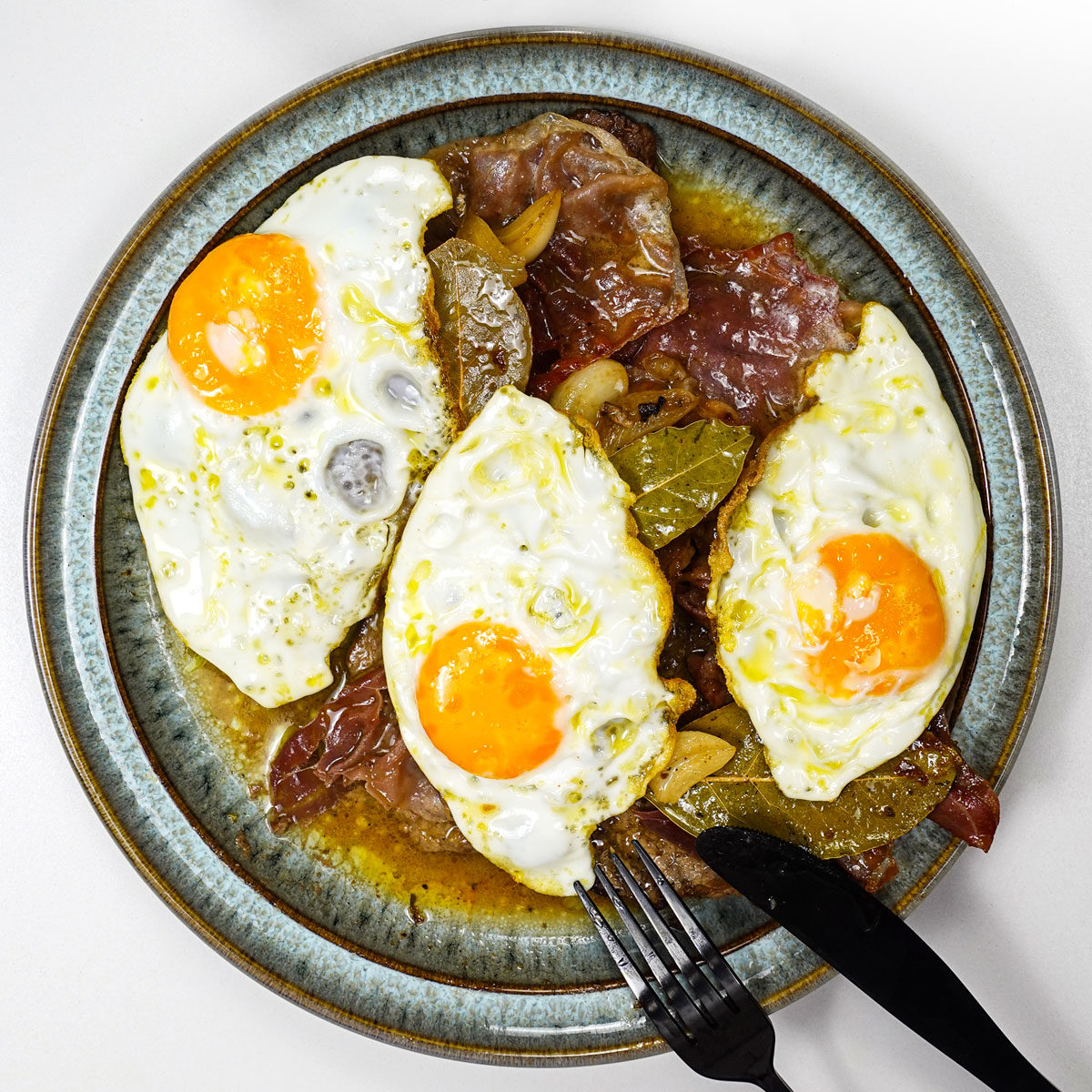 It is comforting yet refined, balancing a juicy beef steak with a delicate fried egg on top. The addition of prosciutto, garlic, bay leaves, and butter creates depth, while white wine adds a layer of acidity and aroma.