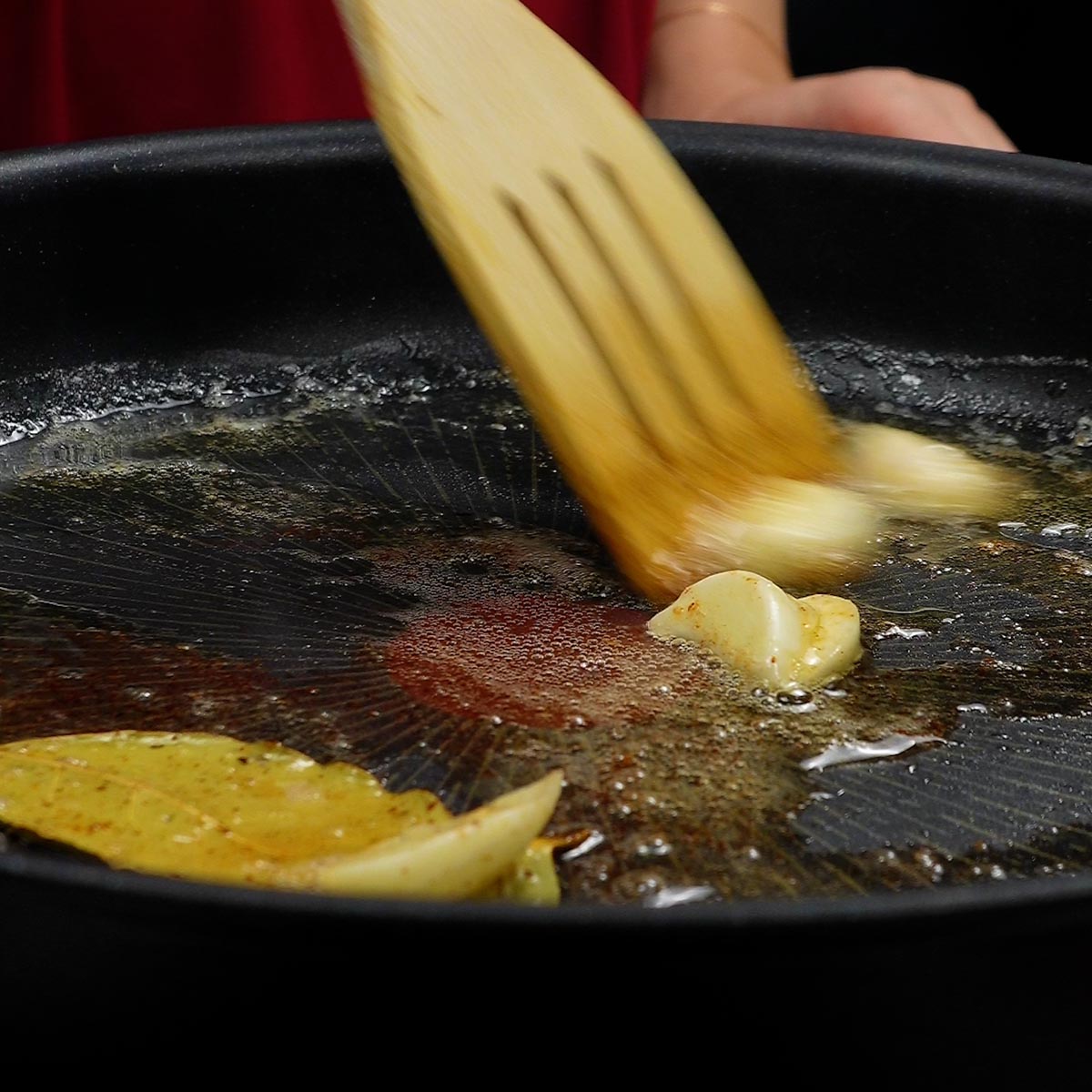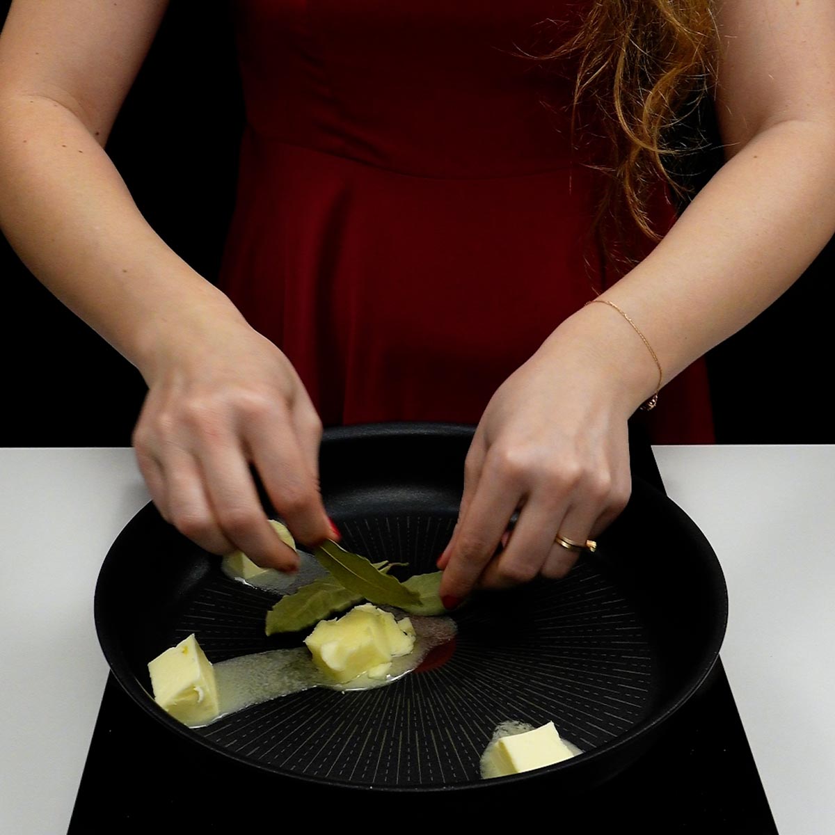 - Deglaze the pan with white wine and bay leaves after searing, reduce until slightly thickened.
