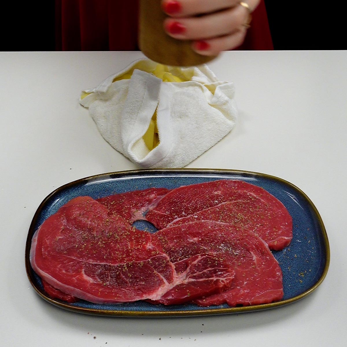 - For presentation, place the steak in the center, arrange prosciutto slices on top of it, top with the egg, spoon over the sauce, and finish with cracked pepper.